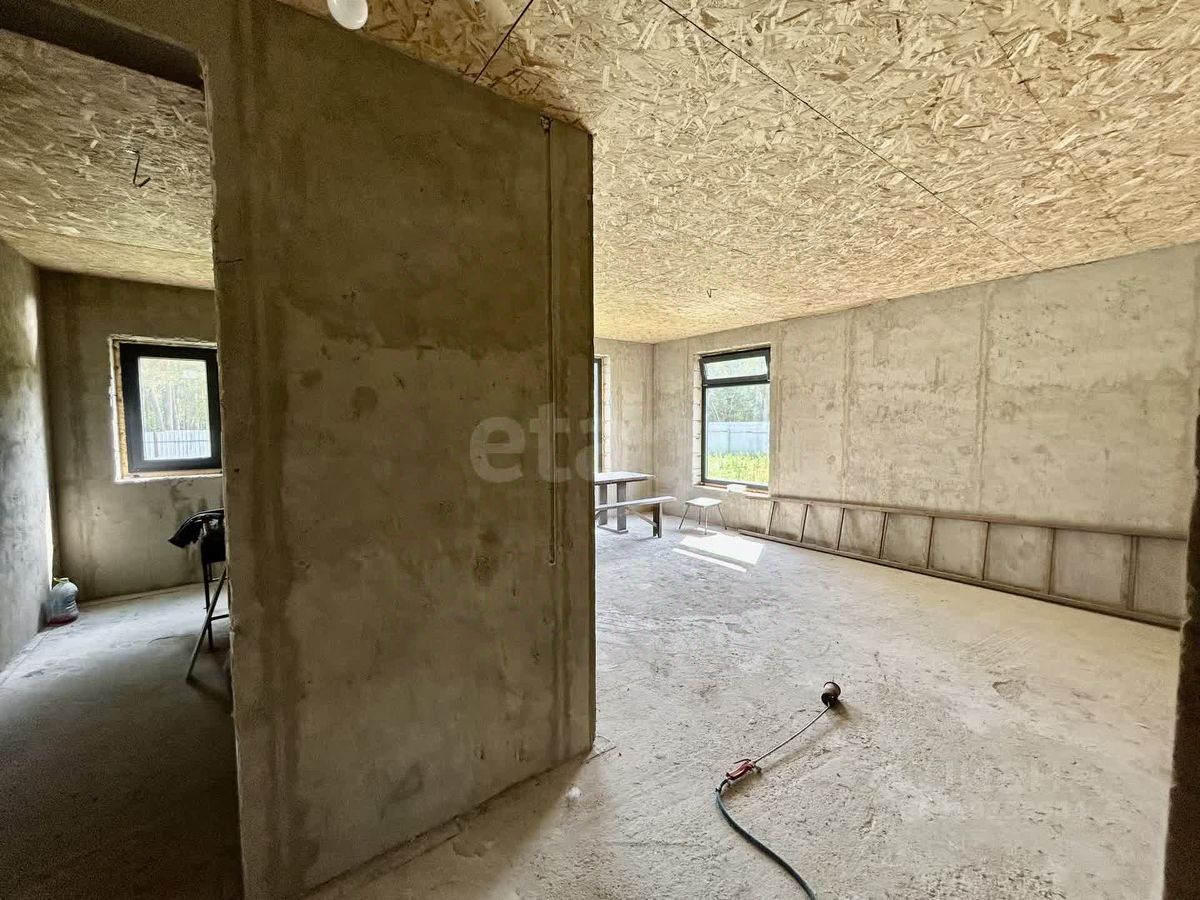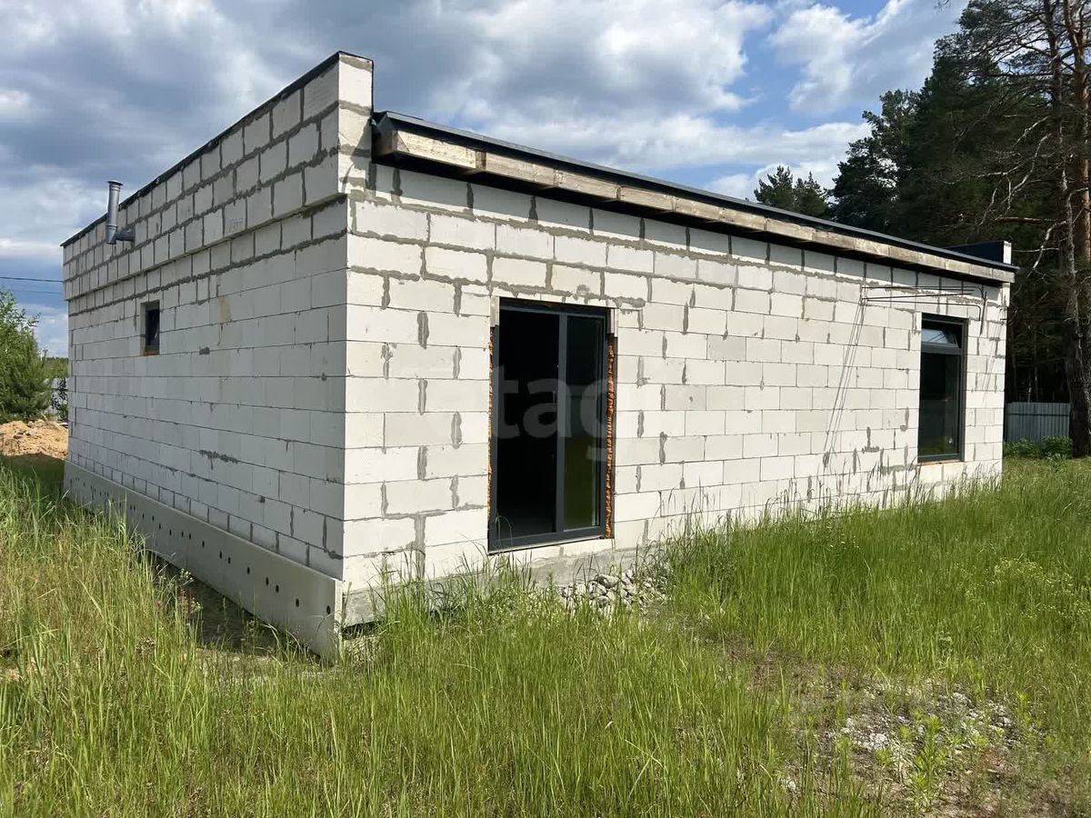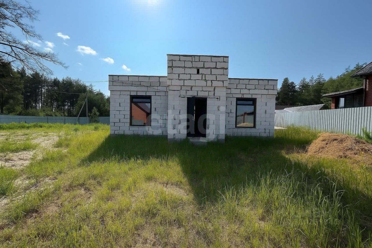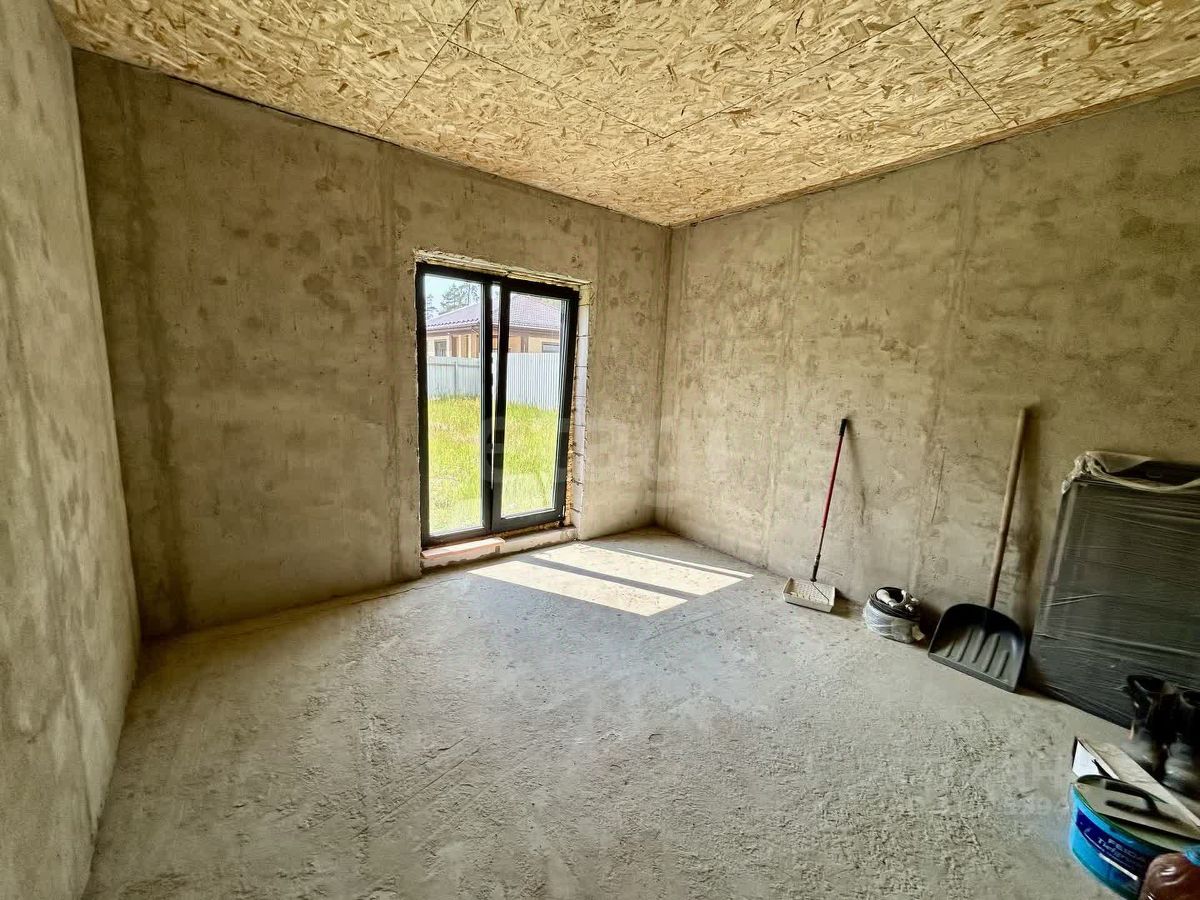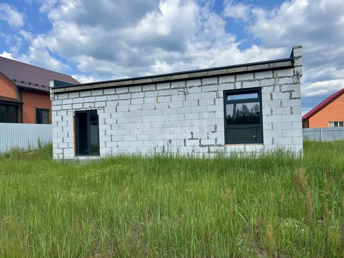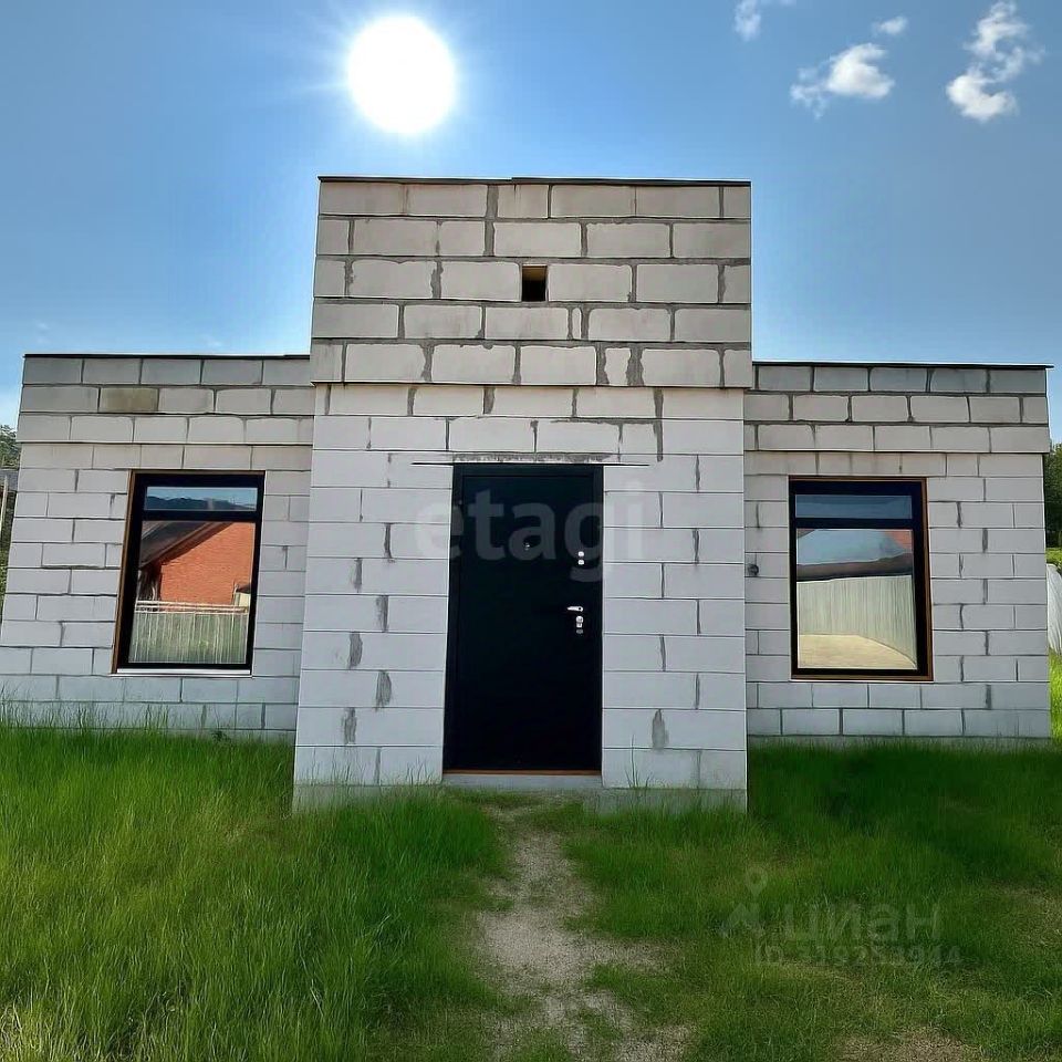 Дом построен по индивидуальному проекту из газо- и пеноблоков на монолитной бетонной плите, что обеспечивает надежность и долговечность конструкции. Крыша выполнена с контр-уклоном, исключающим скопление снега и подтеки у входной зоны. Внутренние стены выровнены, начата разводка электрики. Планировка включает три отдельные комнаты, причем из главной спальни есть выход на улицу.