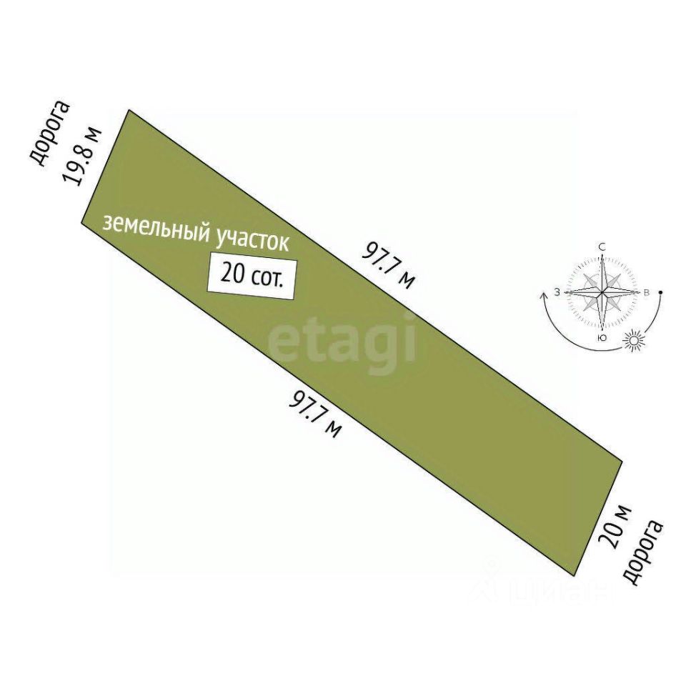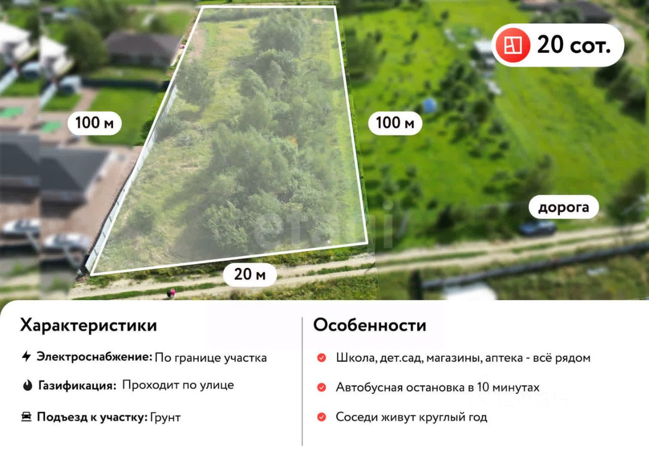 - **Площадь участка:** 20 соток (ширина 20 метров, длина 100 метров) - **Коммуникации:** электричество и газ проходят по границе участка. - **Удобный подъезд:** к участку ведет хорошая дорога, обеспечивающая легкий доступ в любое время года. - **Развивающаяся инфраструктура:** соседи активно застраиваются, что создает атмосферу дружелюбного сообщества. - **Транспортная доступность:** автобусная остановка всего в 10 минутах пешком, регулярные рейсы обеспечивают комфортные поездки в город.