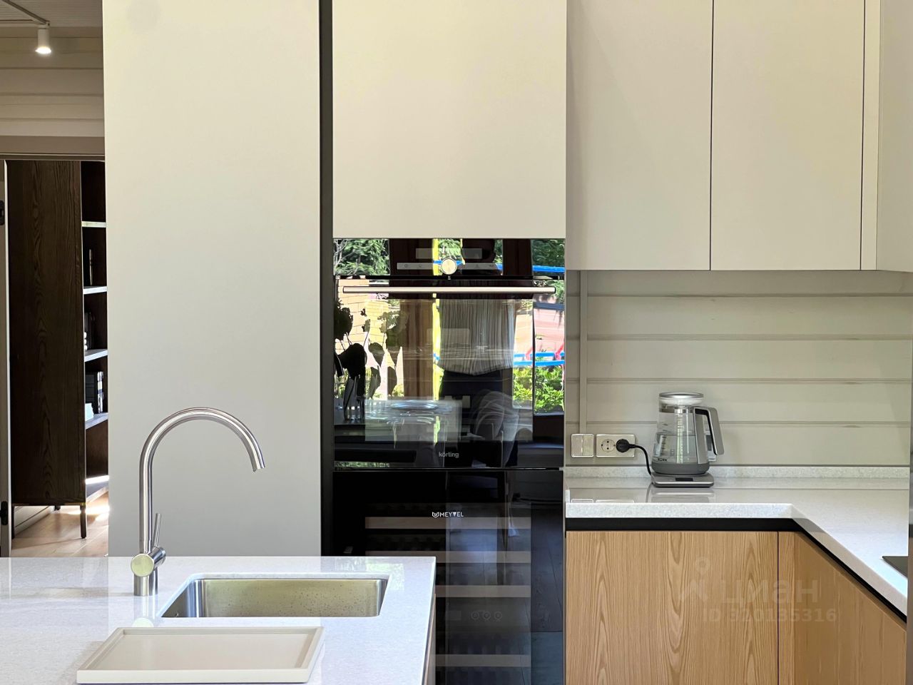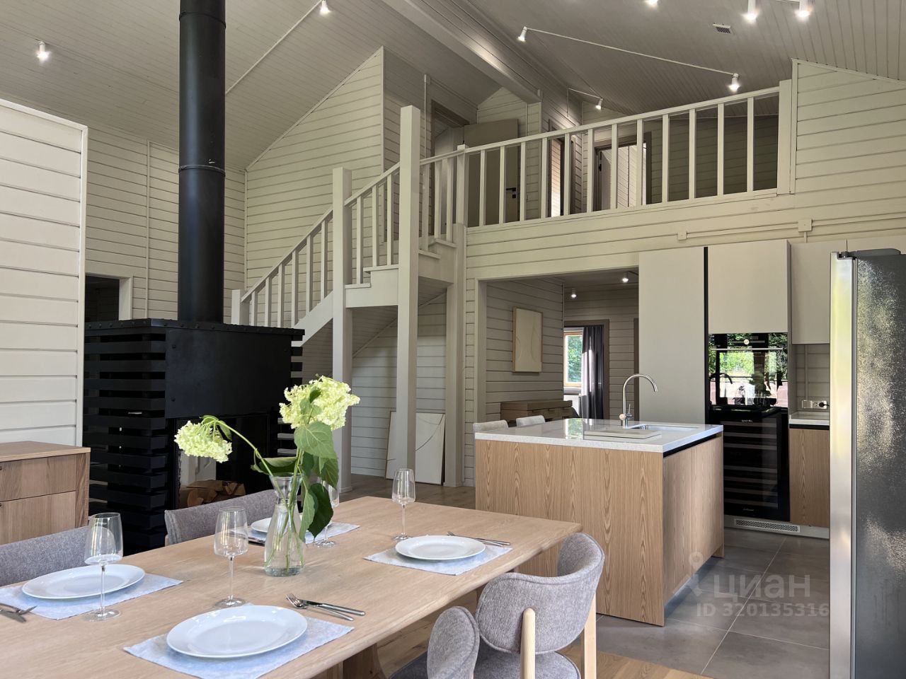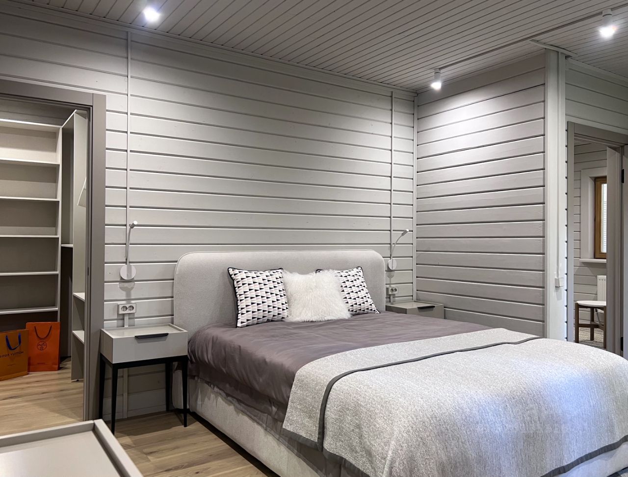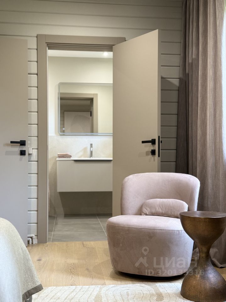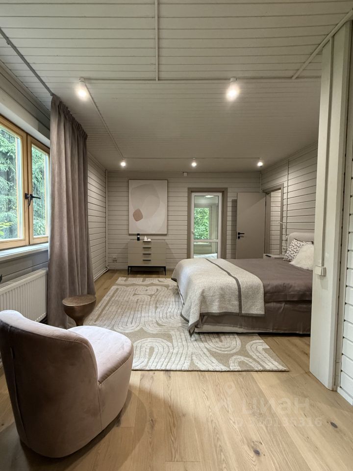 Все шкафы, кухня, гардеробные и кладовая выполнены по индивидуальным эскизам дизайнера. Интерьер продуман до деталей: — Кухня с островом из МДФ и шпона дуба, встроенная техника Korting и Elica, винный шкаф, большой холодильник side-by-side — На полу дубовая инженерная доска от FINEX, — Двери фабрики ESTET, — Просторная кухня-гостиная с камином и выходом на террасу, — 4 спальни, мастер-блок с гардеробной и санузлом, — Отдельный кабинет, сауна, бойлерная, 3 санузла с полной отделкой, 2 террасы. Одна открытая с барбекю, вторая утепленная с выходом в сад, Теплая многофункциональная зона на мансарде площадью 40 м², Уютная терраса меблирована мягкими креслами Dantone. Большой крытый навес площадью 50 кв. м. для 2 машин (можно закрыть в теплый контур). Высота потолков в доме до 5 метров. Все центральные коммуникации. Котел Viessmann Vitodens 100.