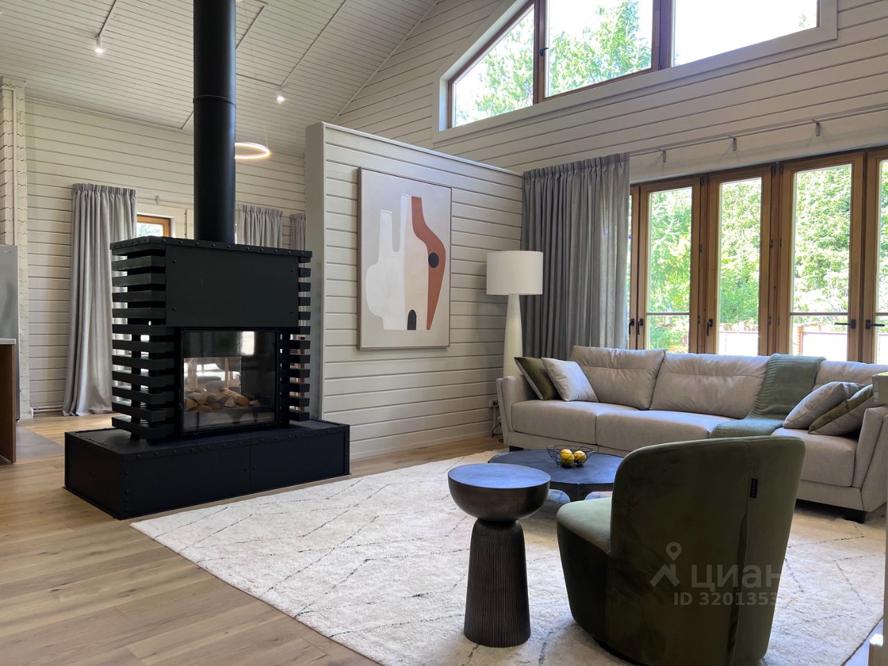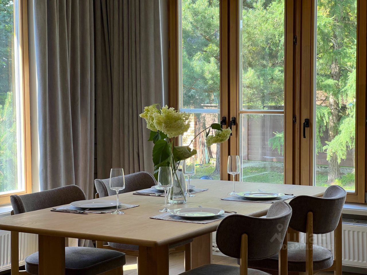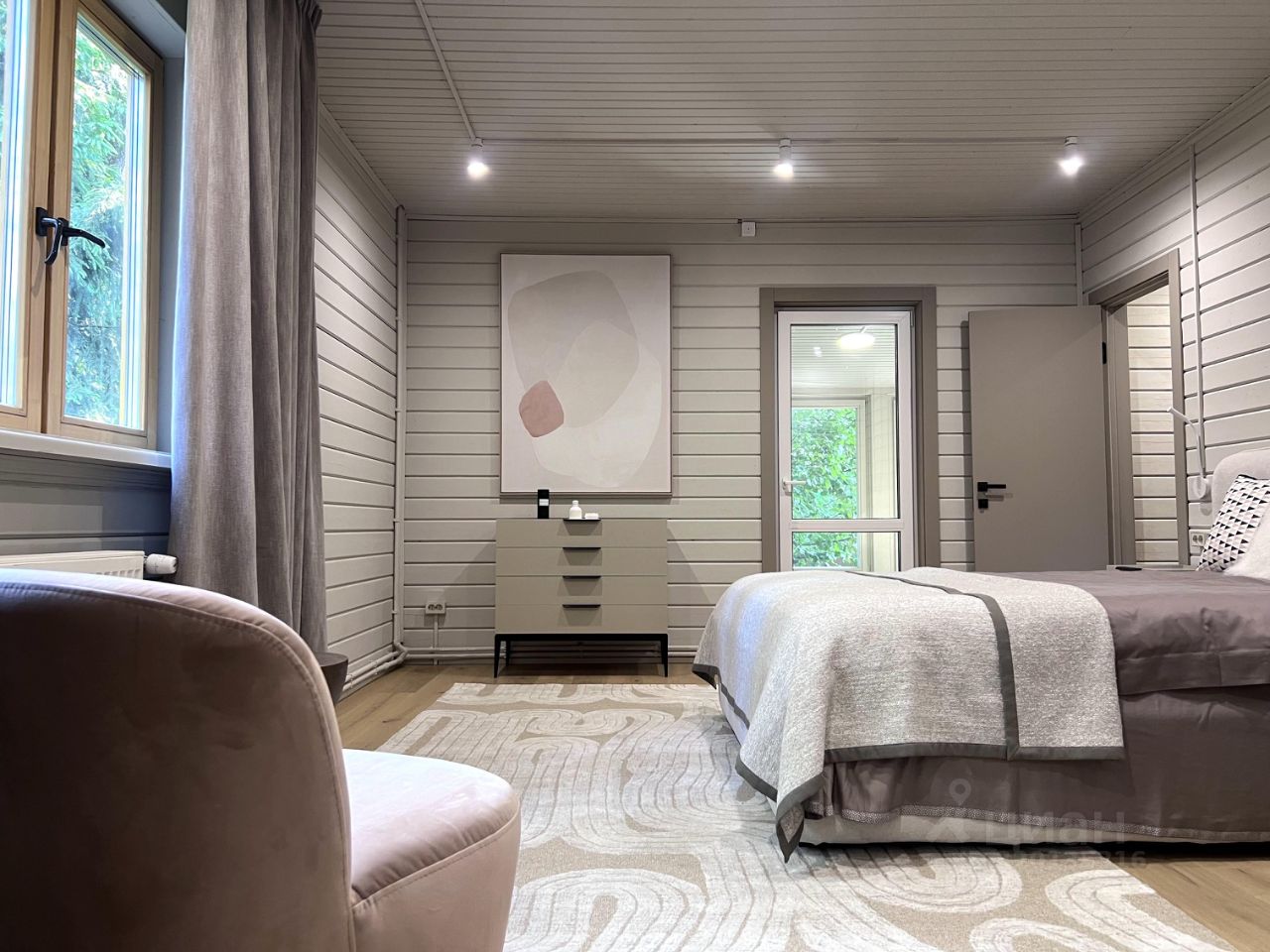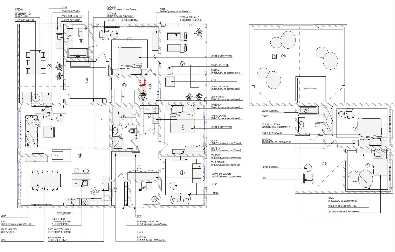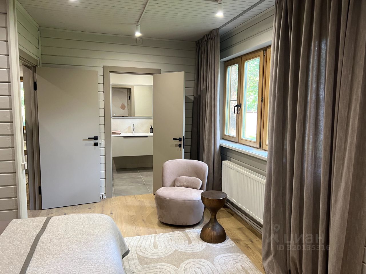 Все шкафы, кухня, гардеробные и кладовая выполнены по индивидуальным эскизам дизайнера. Интерьер продуман до деталей: — Кухня с островом из МДФ и шпона дуба, встроенная техника Korting и Elica, винный шкаф, большой холодильник side-by-side — На полу дубовая инженерная доска от FINEX, — Двери фабрики ESTET, — Просторная кухня-гостиная с камином и выходом на террасу, — 4 спальни, мастер-блок с гардеробной и санузлом, — Отдельный кабинет, сауна, бойлерная, 3 санузла с полной отделкой, 2 террасы. Одна открытая с барбекю, вторая утепленная с выходом в сад, Теплая многофункциональная зона на мансарде площадью 40 м², Уютная терраса меблирована мягкими креслами Dantone. Большой крытый навес площадью 50 кв. м. для 2 машин (можно закрыть в теплый контур). Высота потолков в доме до 5 метров. Все центральные коммуникации. Котел Viessmann Vitodens 100.