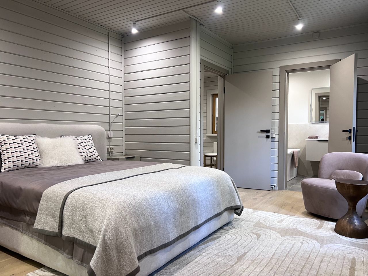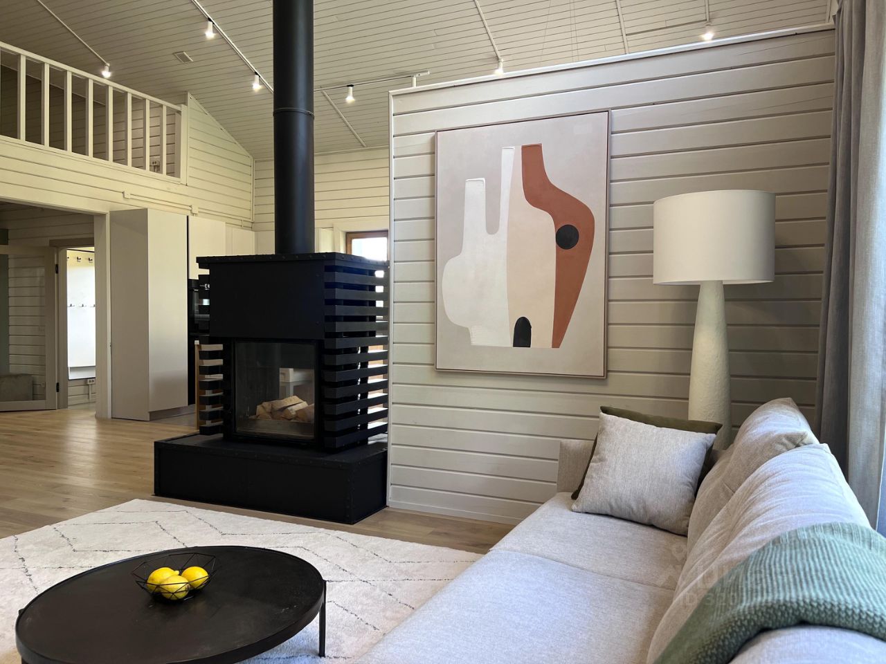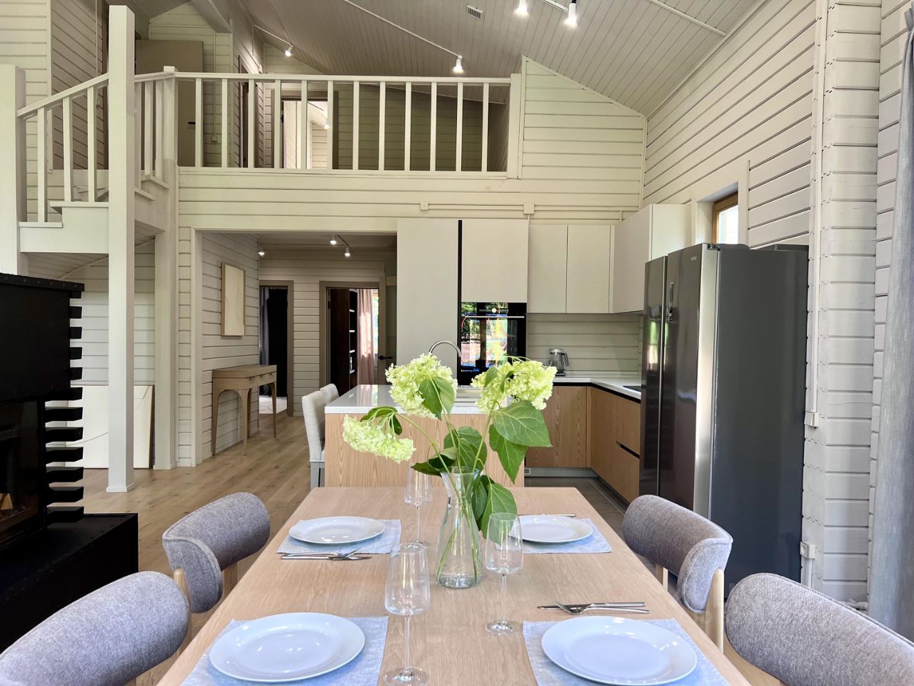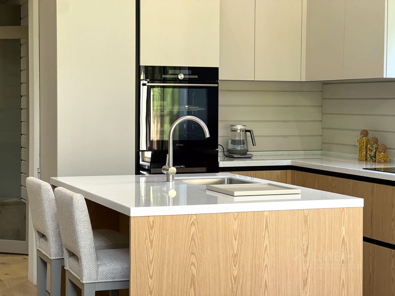 Все шкафы, кухня, гардеробные и кладовая выполнены по индивидуальным эскизам дизайнера. Интерьер продуман до деталей: — Кухня с островом из МДФ и шпона дуба, встроенная техника Korting и Elica, винный шкаф, большой холодильник side-by-side — На полу дубовая инженерная доска от FINEX, — Двери фабрики ESTET, — Просторная кухня-гостиная с камином и выходом на террасу, — 4 спальни, мастер-блок с гардеробной и санузлом, — Отдельный кабинет, сауна, бойлерная, 3 санузла с полной отделкой, 2 террасы. Одна открытая с барбекю, вторая утепленная с выходом в сад, Теплая многофункциональная зона на мансарде площадью 40 м², Уютная терраса меблирована мягкими креслами Dantone. Большой крытый навес площадью 50 кв. м. для 2 машин (можно закрыть в теплый контур). Высота потолков в доме до 5 метров. Все центральные коммуникации. Котел Viessmann Vitodens 100.