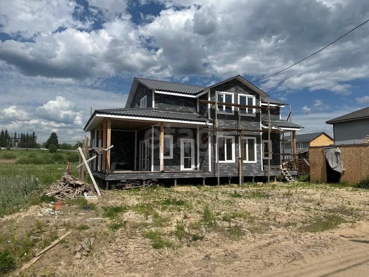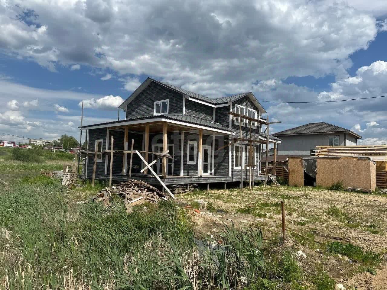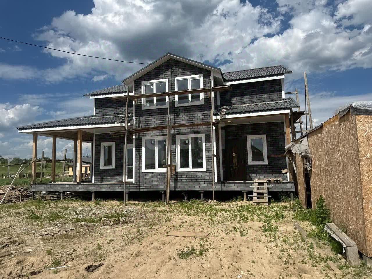 Дом двухэтажный, сделан снаружи в темно-серых тонах, с аккуратной отделкой фасада под кирпичную плитку. Сейчас идут финальные работы. Кровля металлическая, выполненная под классическую черепицу, выглядит надежно и придает дому солидный внешний вид. По периметру дома чисто, однако строительные материалы временно находятся поблизости, ожидая своего часа.