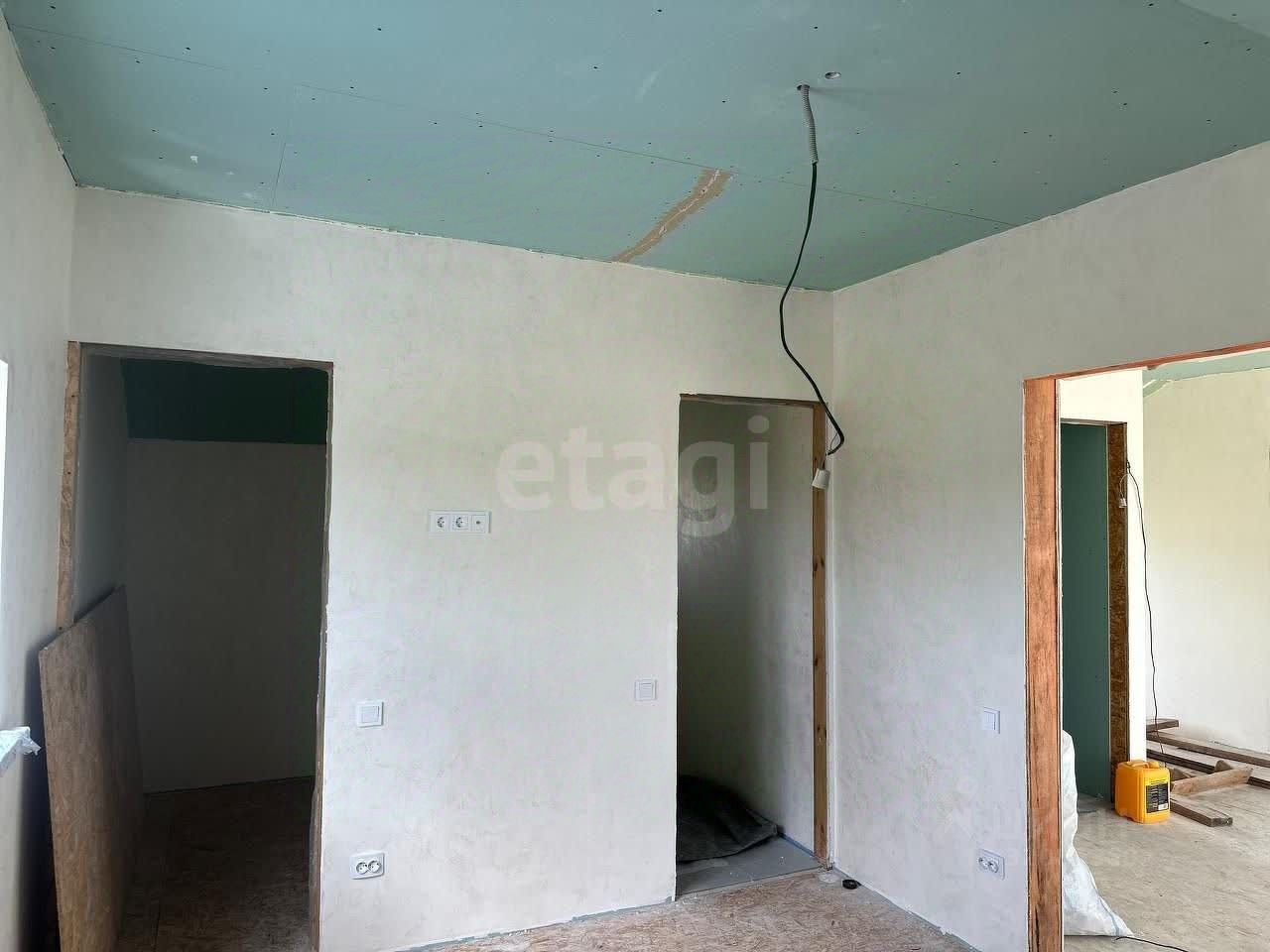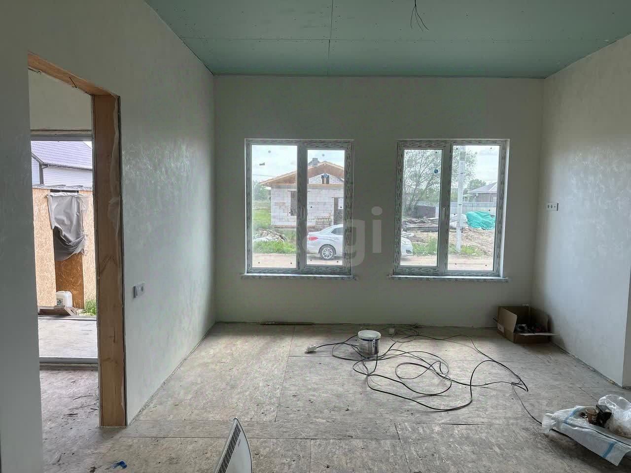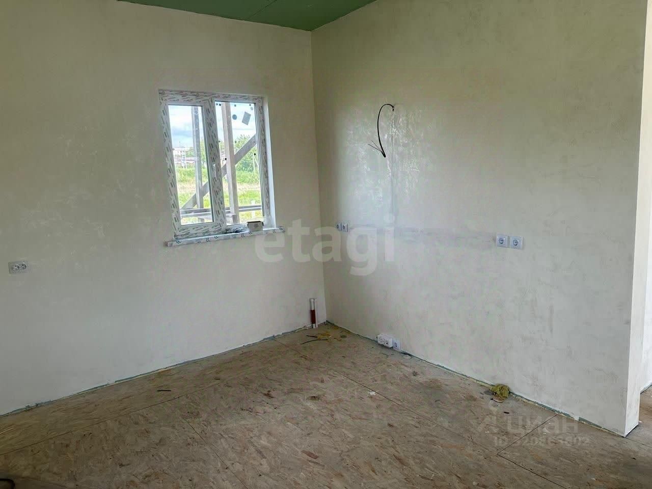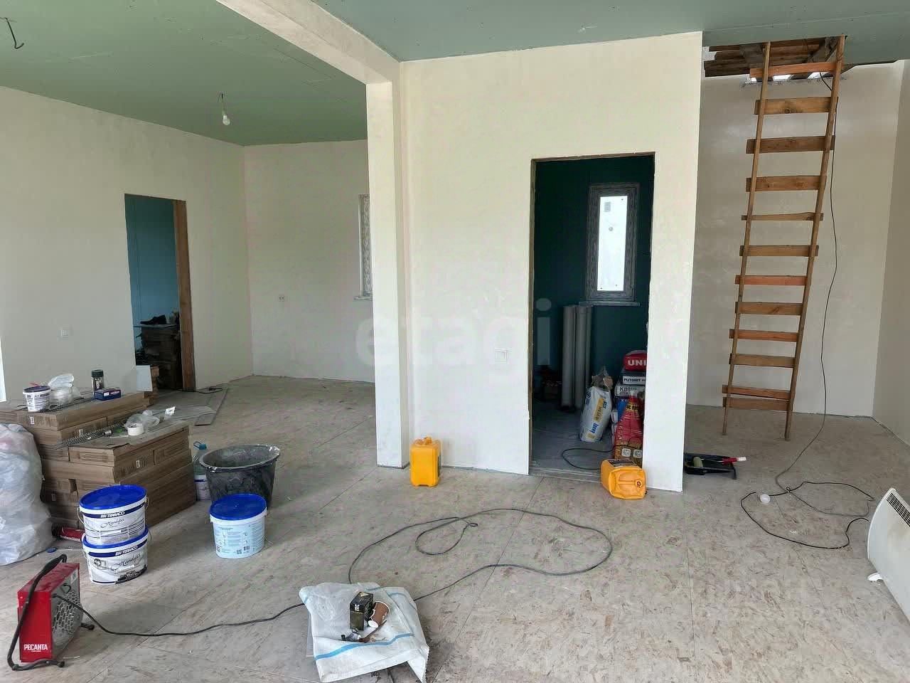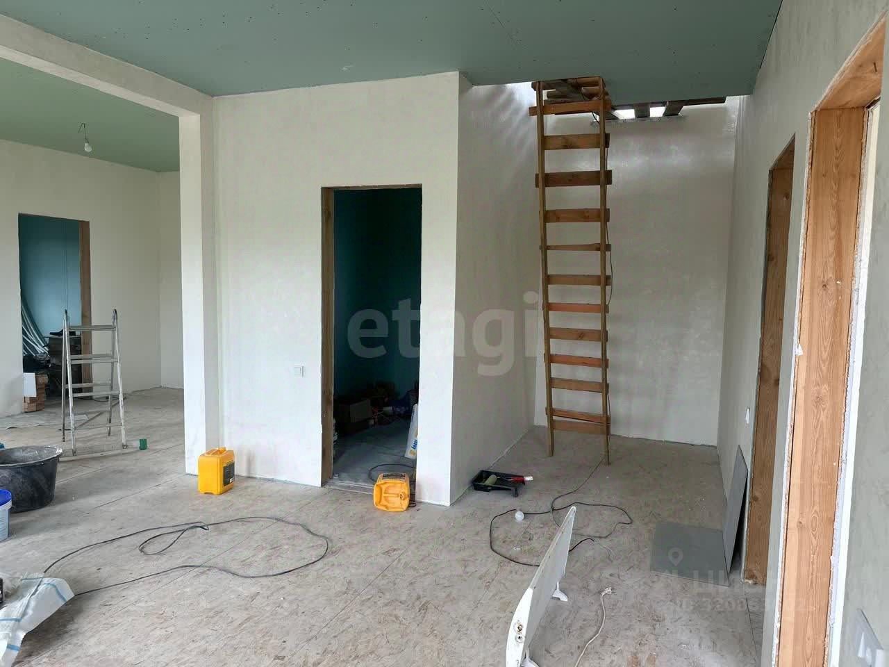 Внутренняя обстановка радует глаз: стены уже выровнены и оштукатурены, аккуратно окрашены в приятные светлые тона. Покрытие пола — листовой материал OSB, готовый принять финишное напольное покрытие. Потолки выполнены из качественного гипсокартона и украшают пространство приятным нежно-зеленым оттенком. Электрический монтаж также близится к завершению — видно проводку, которая вскоре станет частью законченной системы.