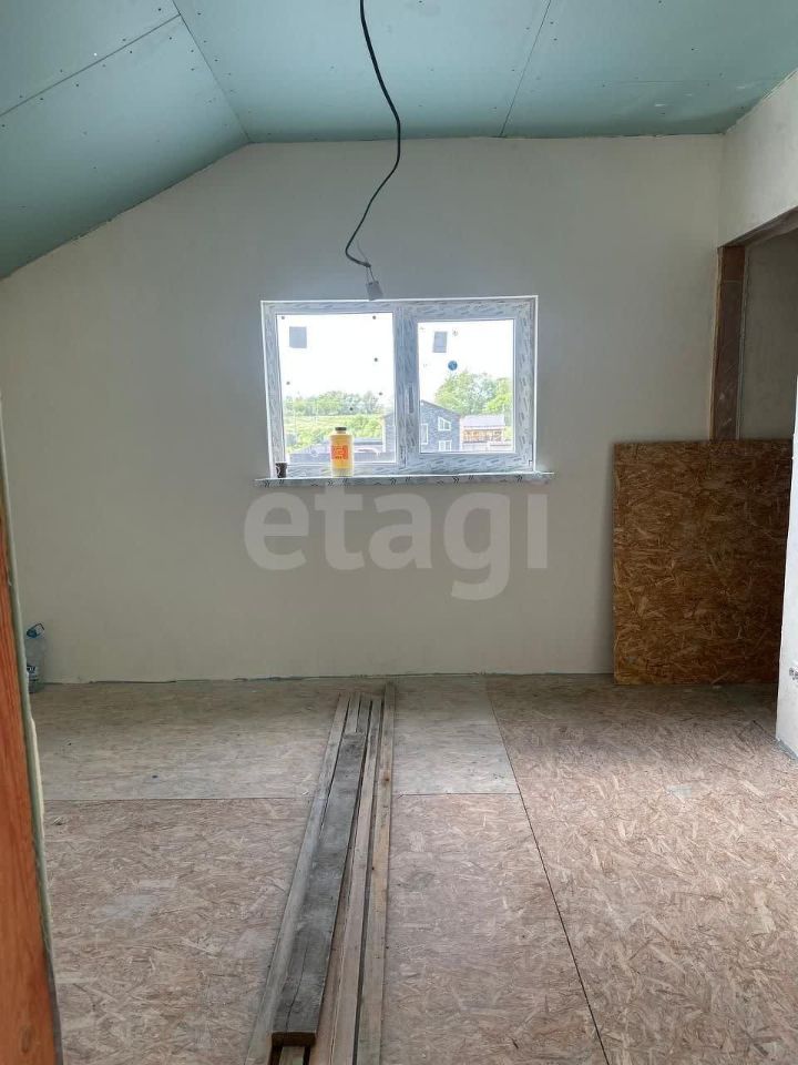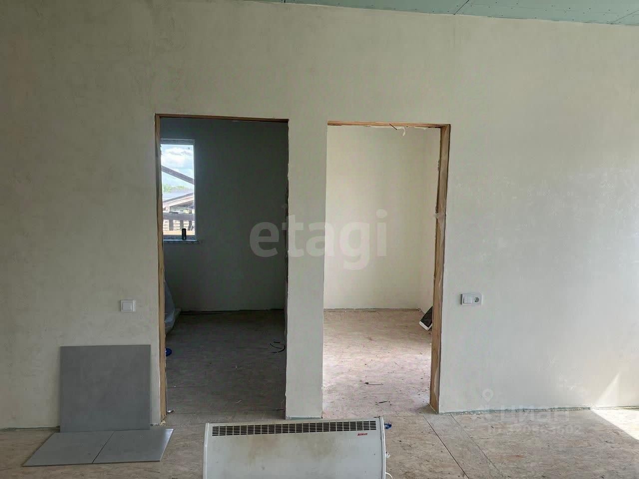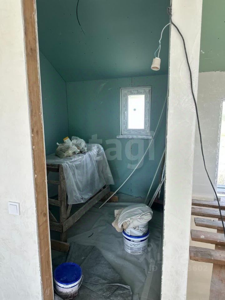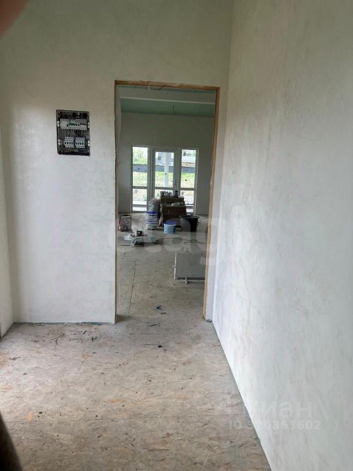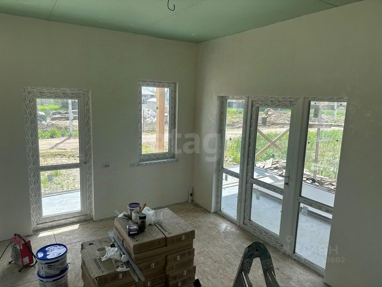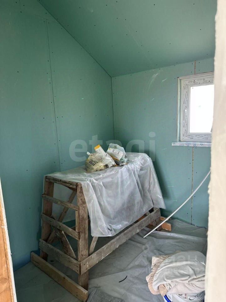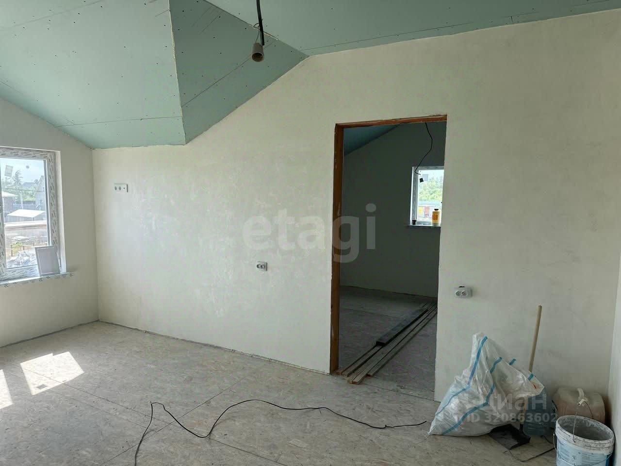 Внутренняя обстановка радует глаз: стены уже выровнены и оштукатурены, аккуратно окрашены в приятные светлые тона. Покрытие пола — листовой материал OSB, готовый принять финишное напольное покрытие. Потолки выполнены из качественного гипсокартона и украшают пространство приятным нежно-зеленым оттенком. Электрический монтаж также близится к завершению — видно проводку, которая вскоре станет частью законченной системы.