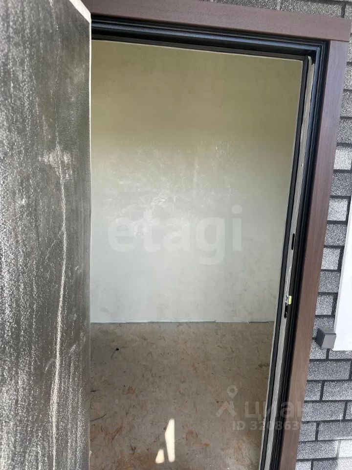 Перед входом расположено крыльцо с навесом, защищающее от непогоды. Дверь уже установлена — добротная металлическая конструкция с изящным узором. Окна — качественные пластиковые, белого цвета, достаточно крупные, что обеспечит помещения хорошим естественным светом..