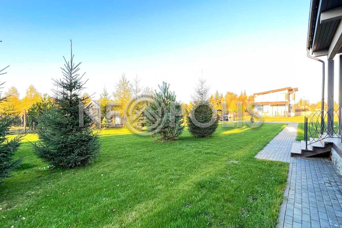 Красивый ровный участок, застелен рулонным газоном, высажены декоративные хвойные и лиственные деревья. Участок правильной формы.