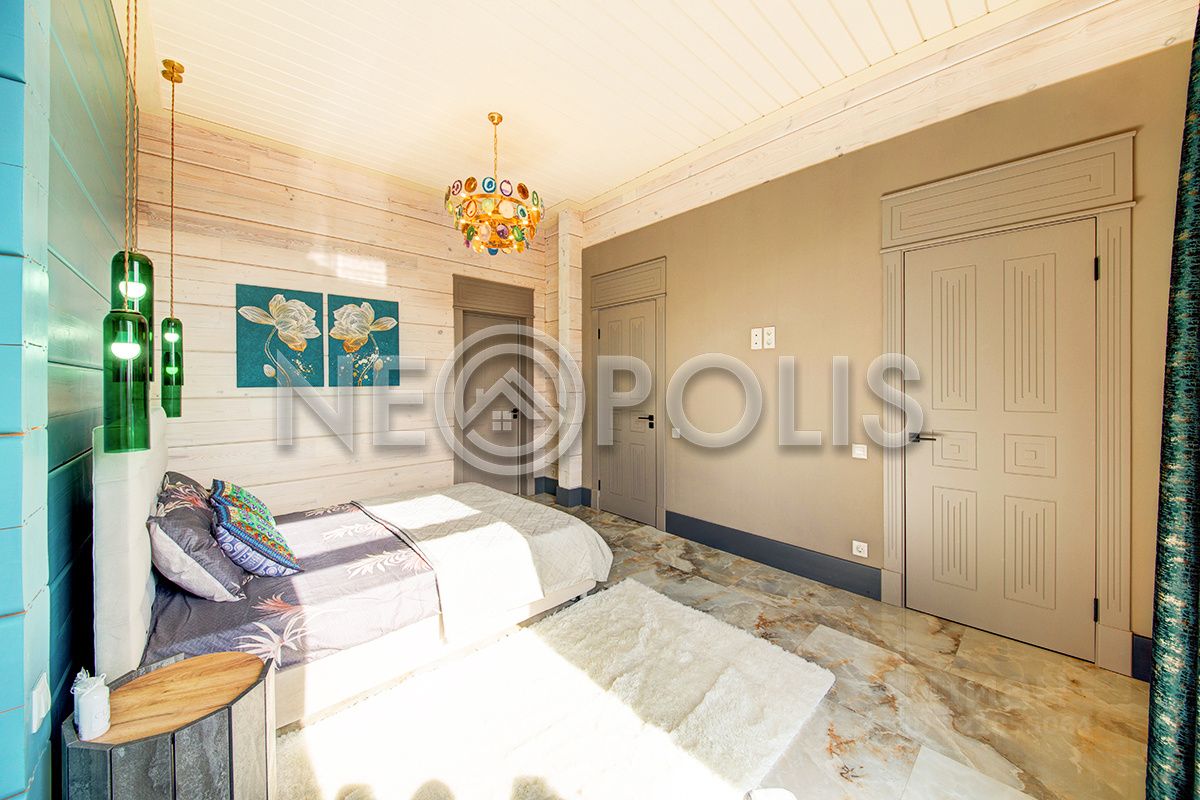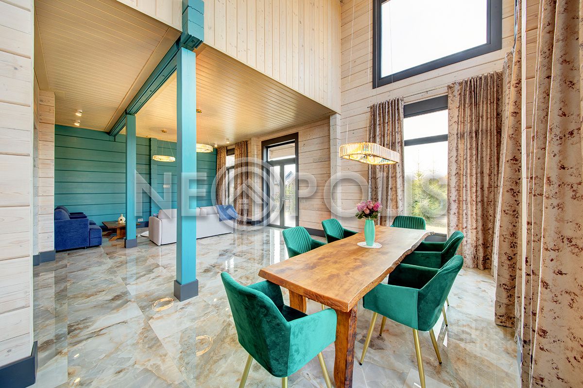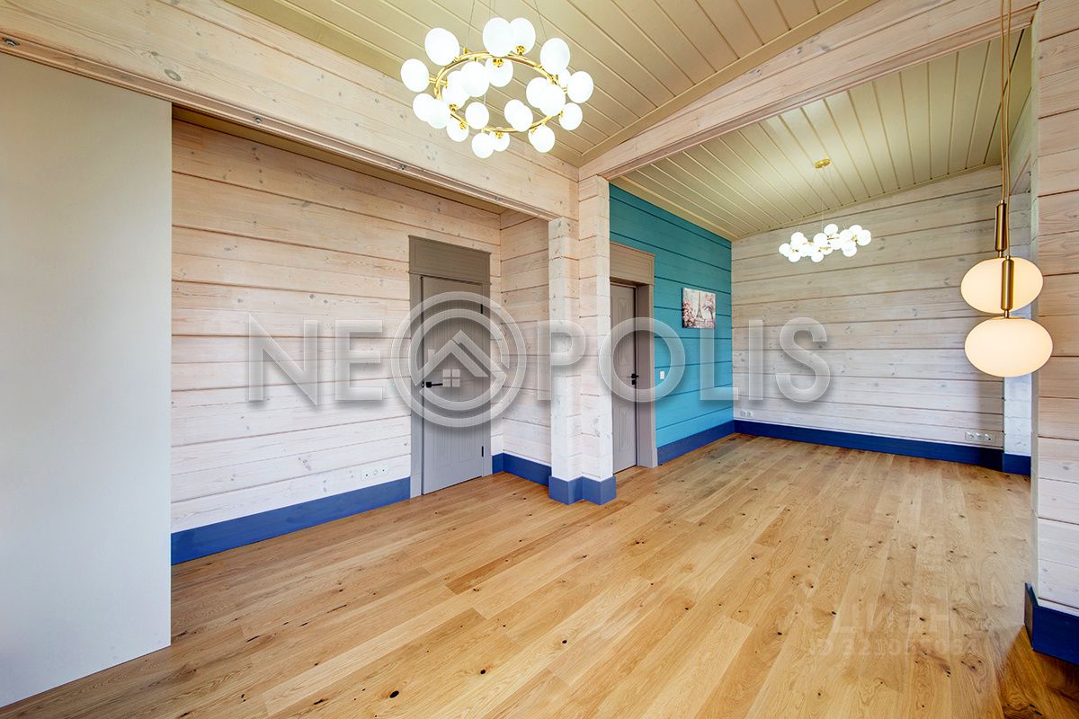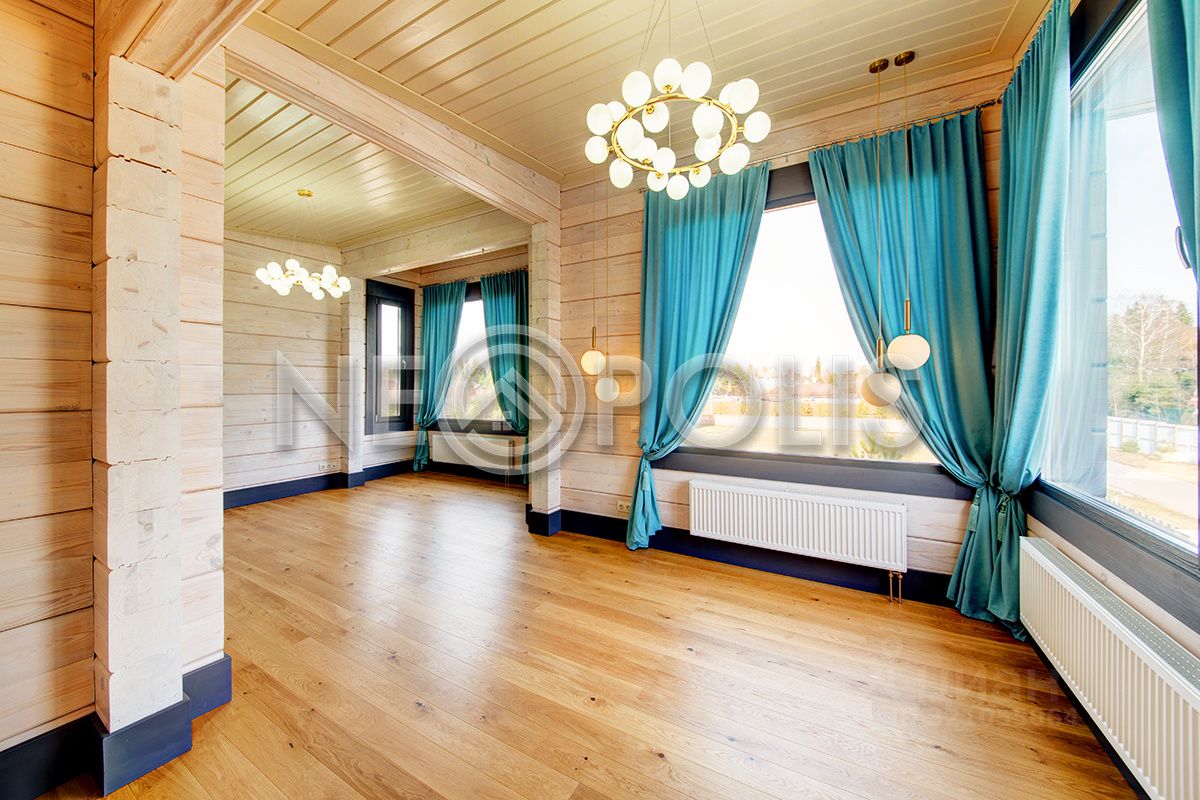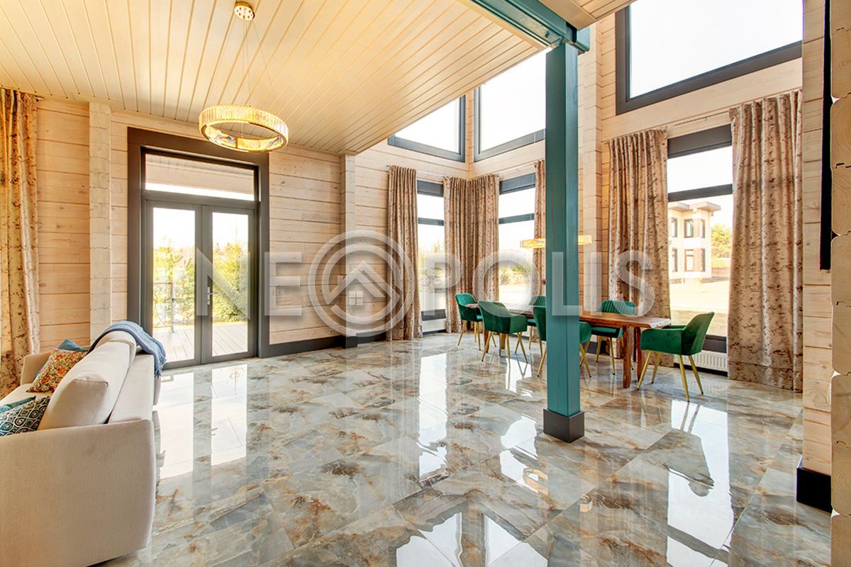 Клееный брус славится своей экологичностью. В отделке дома участвовал дизайнер, использованы дорогие и качественные отделочные материалы. Дом обставлен мебелью, есть встроенная кухня с бытовой техникой, спальные гарнитуры, сантехника, светильники и шторы.