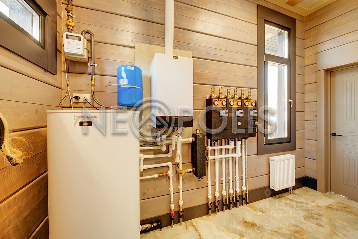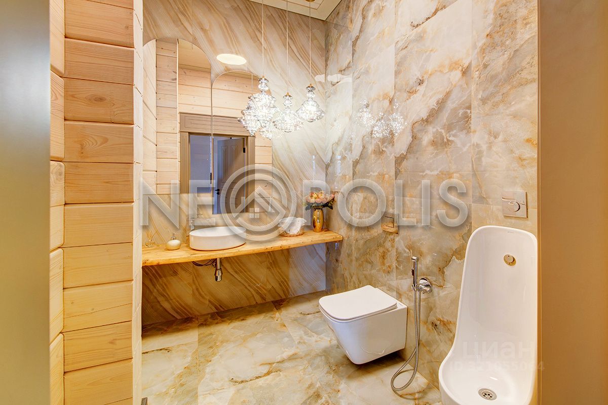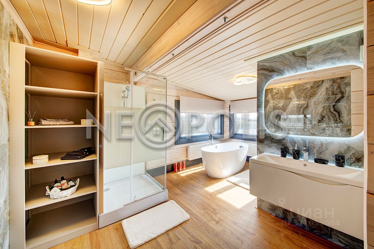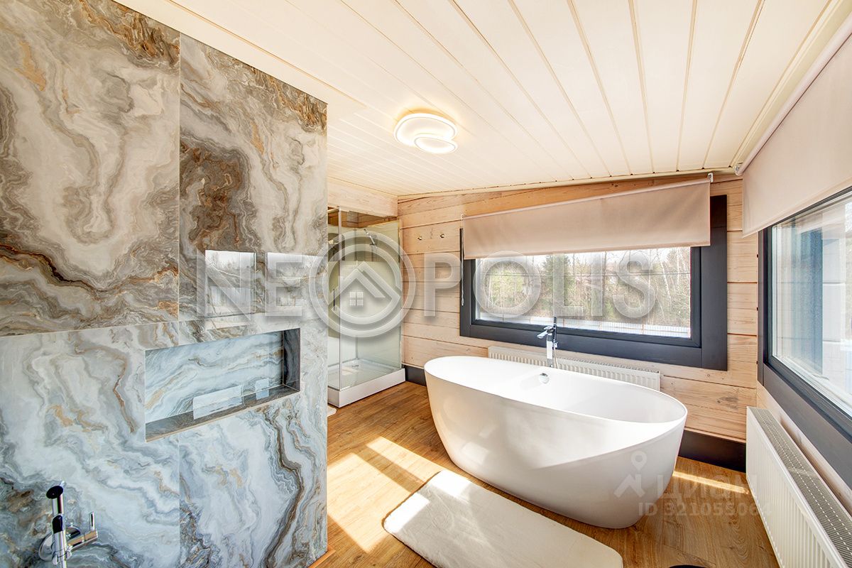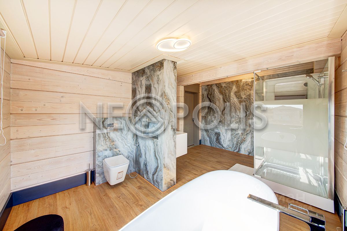 Клееный брус славится своей экологичностью. В отделке дома участвовал дизайнер, использованы дорогие и качественные отделочные материалы. Дом обставлен мебелью, есть встроенная кухня с бытовой техникой, спальные гарнитуры, сантехника, светильники и шторы.