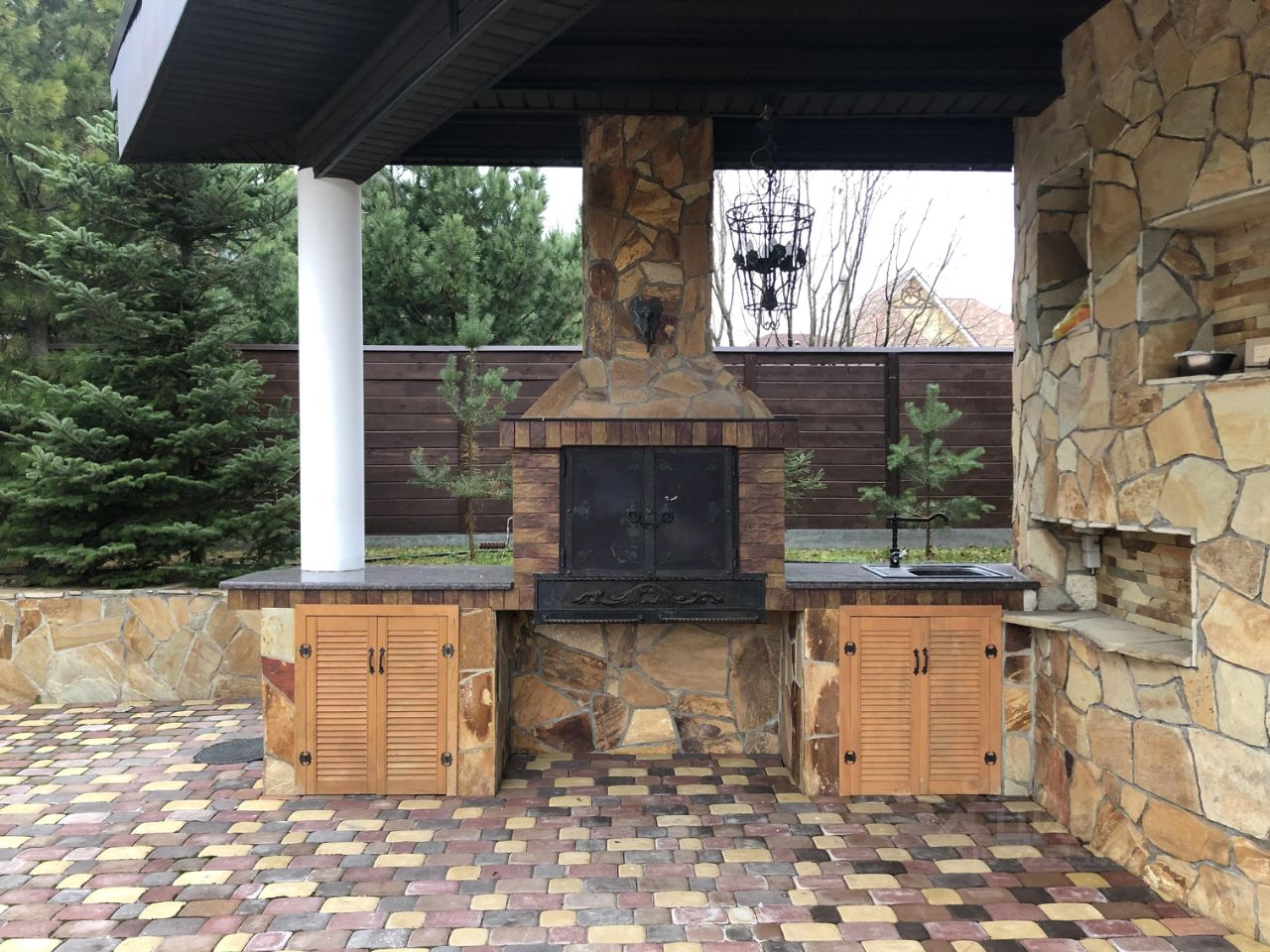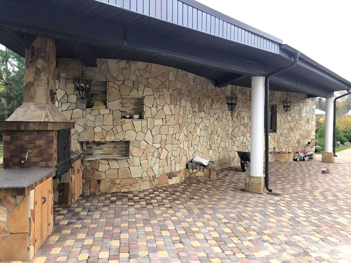 1й этаж : зал (65 м2) с большим камином и местом для кухни, гардероб (под финишную декор отделку), 2 с/узла (отделаны). Выход на террасу с просторным барбекю